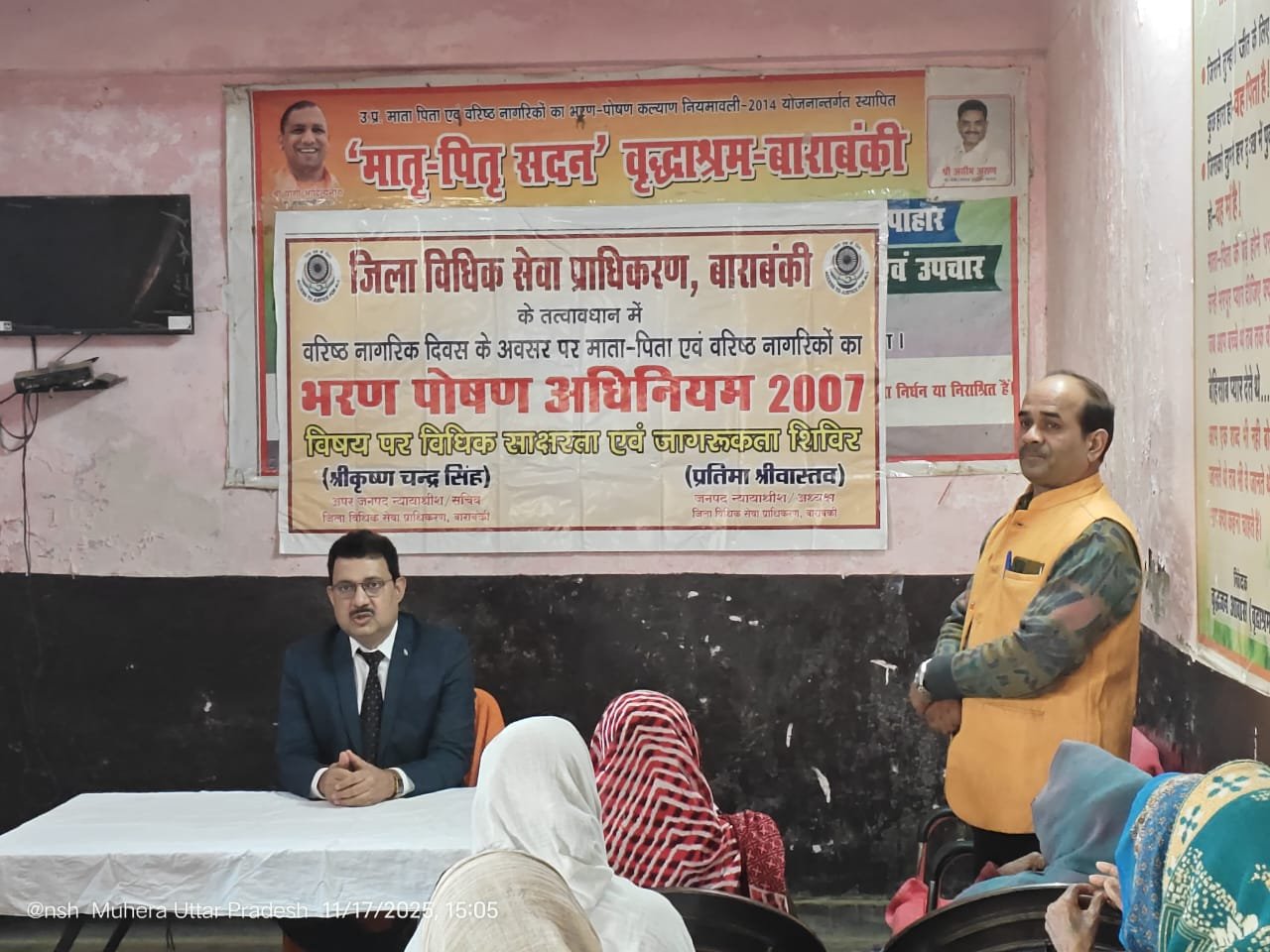 Barabanki News: बुजुर्गों के सम्मान और उनके अधिकारों की सुरक्षा को ध्यान में रखते हुए बाराबंकी के सफेदाबाद स्थित मातृपित्र सदन में आज एक महत्वपूर्ण विधिक जागरूकता शिविर का आयोजन किया गया। शिविर में उपस्थित वरिष्ठ नागरिकों को भरण-पोषण एवं कल्याण अधिनियम 2007 के प्रावधानों के बारे में विस्तार से जानकारी दी गई।