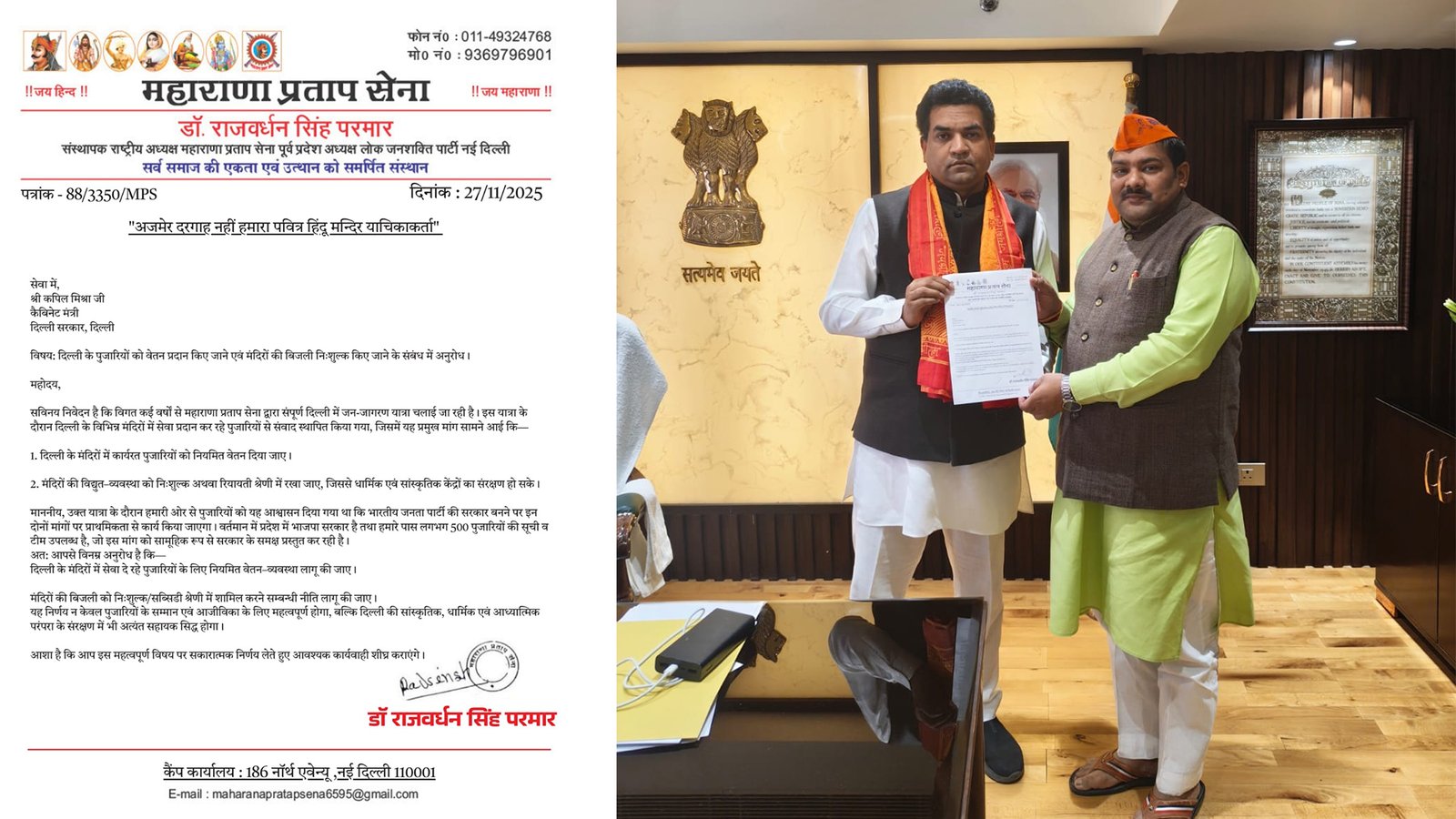 Delhi News: पुजारियों को ‘धर्म रक्षक’ का दर्जा देने की मांग, महाराणा प्रताप सेना ने मंत्री कपिल मिश्रा को सौंपा पत्र November 27, 2025 2:59 pm