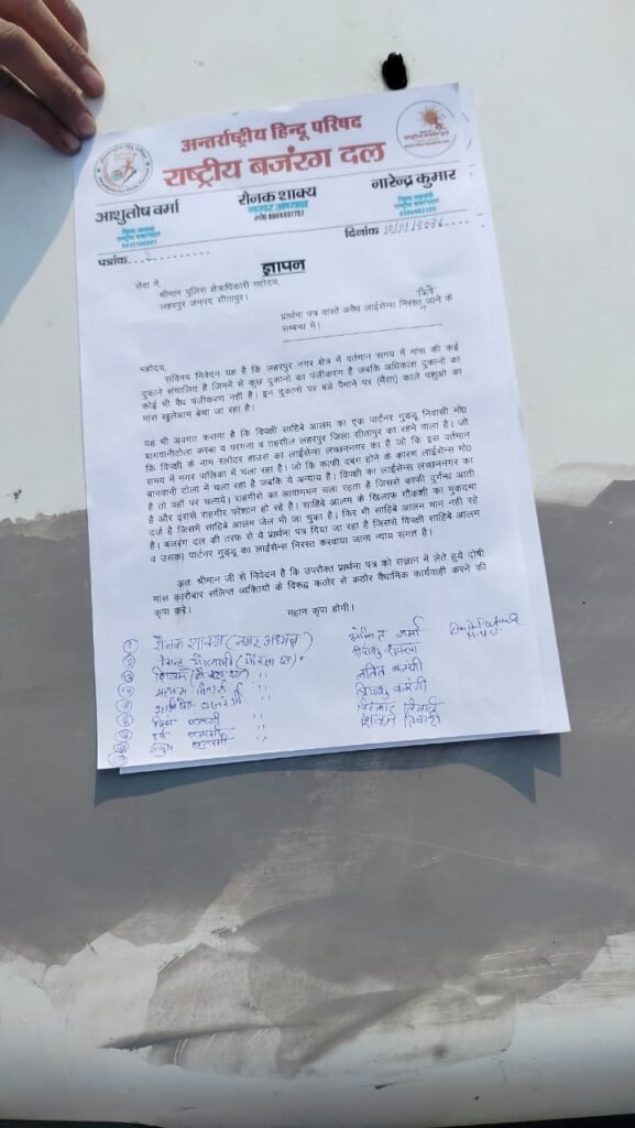 Sitapur News: लहरपुर नगर क्षेत्र में लंबे समय से संचालित हो रही अवैध मीट दुकानों को लेकर अंतरराष्ट्रीय हिन्दू परिषद और राष्ट्रीय बजरंग दल ने प्रशासन के विरुद्ध कड़ा रुख अपनाया है। संगठनों के पदाधिकारियों ने क्षेत्रीय पुलिस अधीक्षक को चेतावनी भरा ज्ञापन सौंपकर तत्काल और प्रभावी कार्रवाई की मांग की।